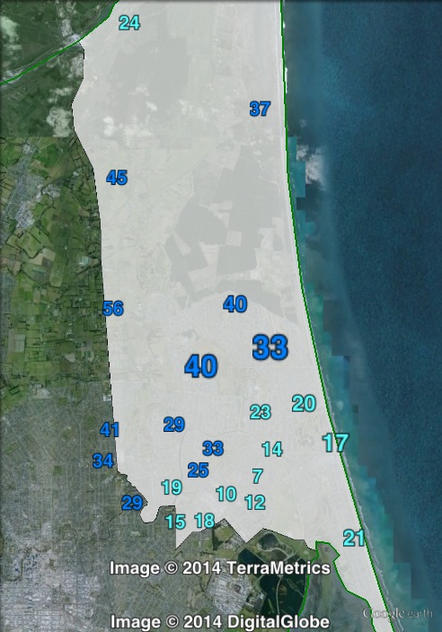 Booths in Christchurch East have been divided into five areas. Most of the electorate’s population lies in the southern half of the electorate – these areas are split into East, West, South and Central. The sparsely-populated North has also been grouped together. The new boundaries have been used to analyse the 2011 election results, but this is not possible for the 2013 by-election results. For the by-election, West and South were merged into South.