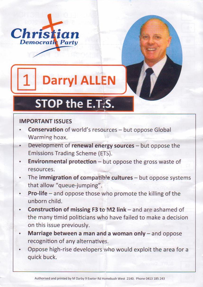 Apparently the CDP has run nine candidates in order to grab attention and to bring attention to the Emissions Trading Scheme. Reading the back of Darryl Allen’s how-to-vote, four of his eight policy points relate to the environment, a fascinating focus for a party that has traditionally focused on social conservative issues and anti-Muslim policies.