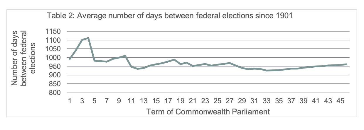 There are lengthy periods throughout federal history when parliamentary terms are consistently close to three years. Indeed, prior to 1949, only three parliaments ended up being notably short: 1913-14, 1928-29 and 1929-31.
