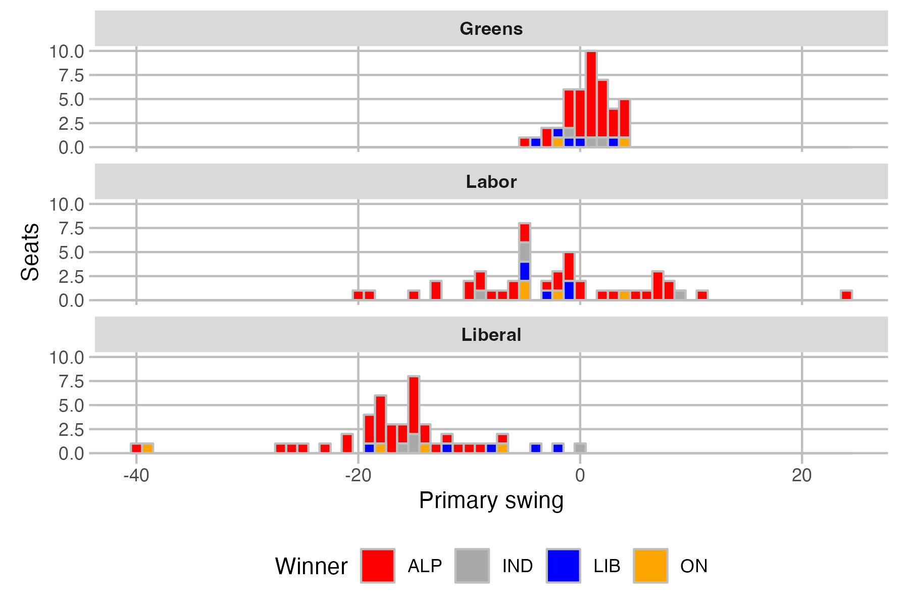 I have been reading some very old psephological work from the 1970s recently, and a tool used often by analysts like Malcolm Mackerras was a histogram, often showing the distribution of swings. This is a special kind of bar graph where each column lists how many cases fit in that range or bucket.