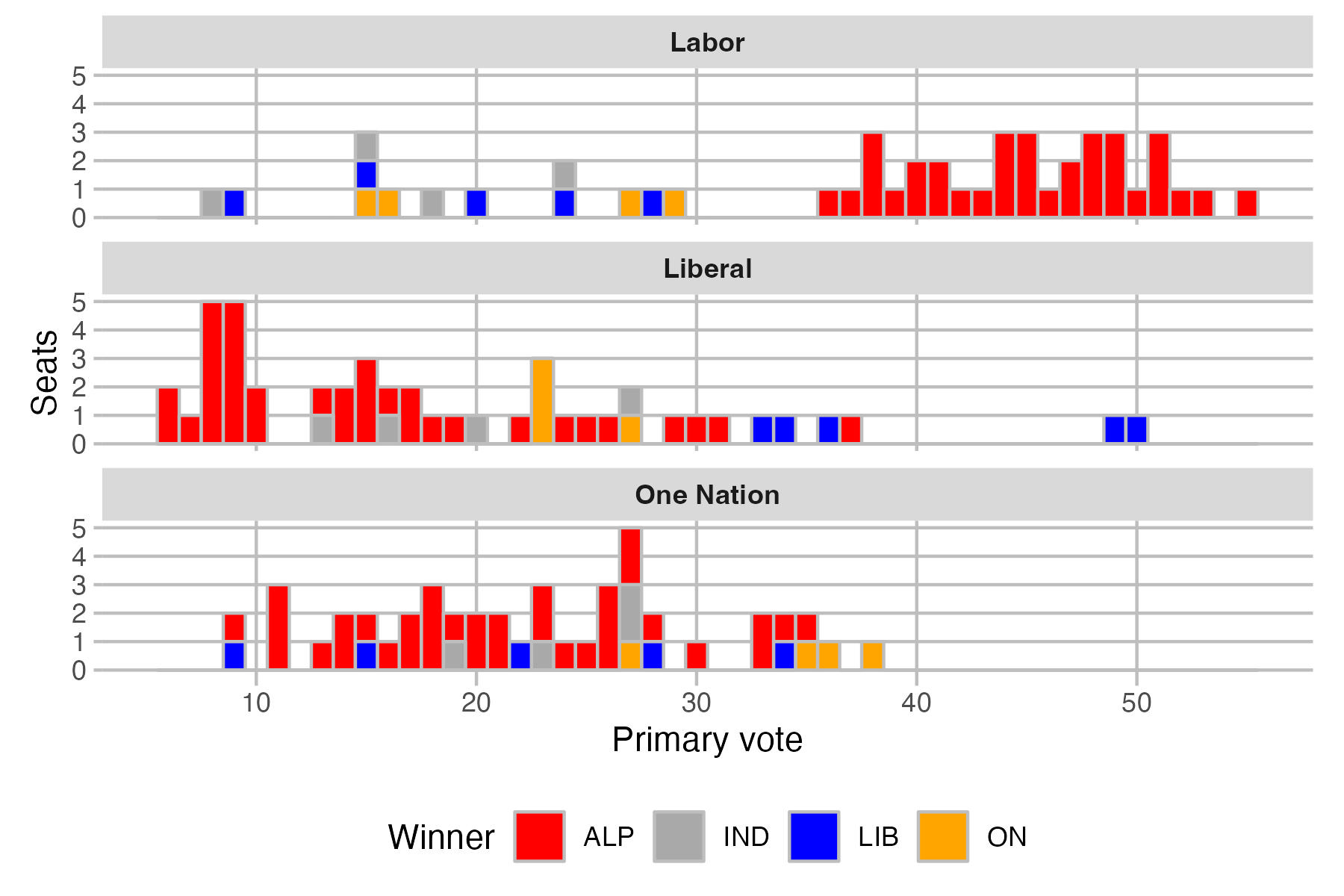 This chart shows the distribution of primary votes for the three largest parties. Seats are coloured based on who won that seat.