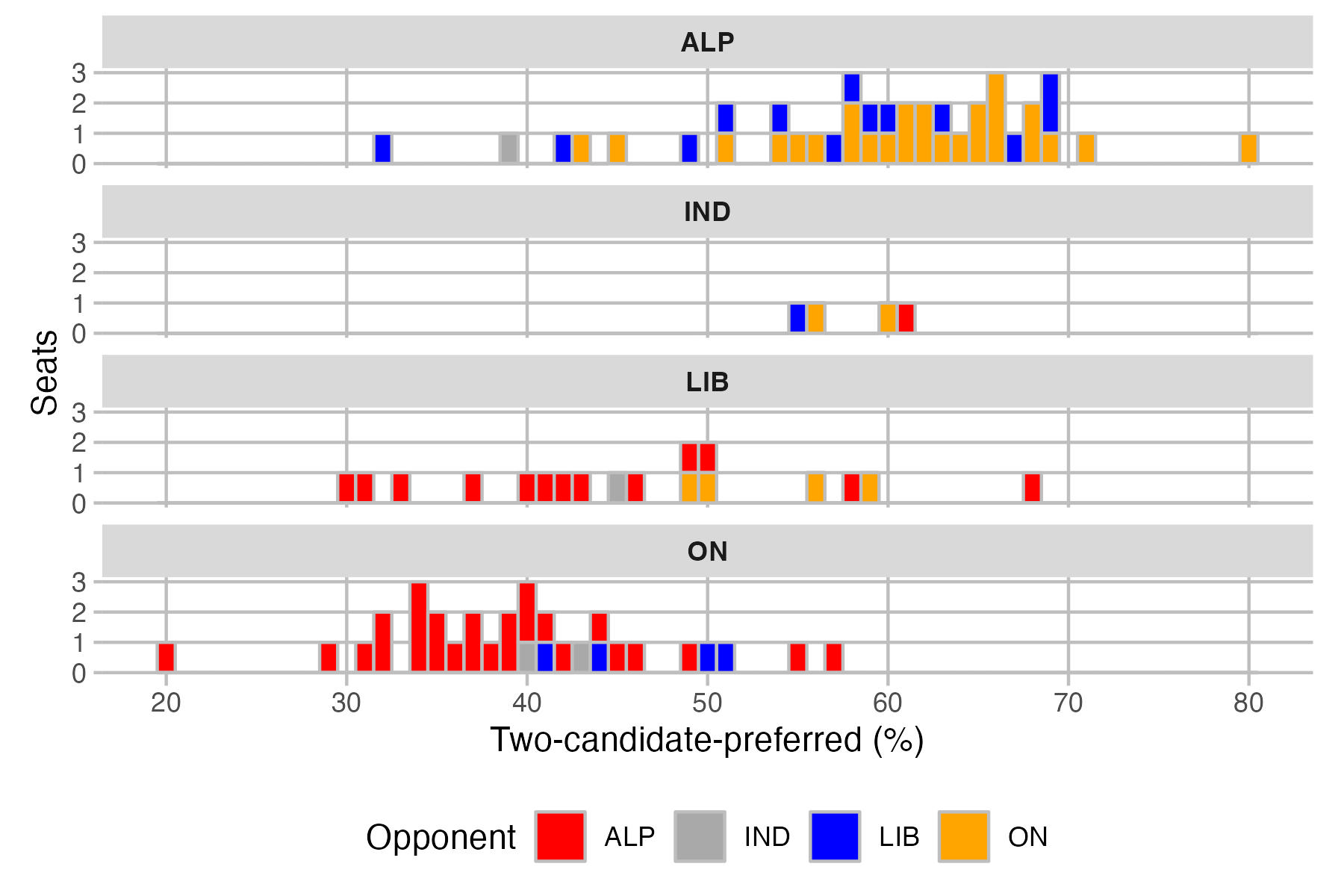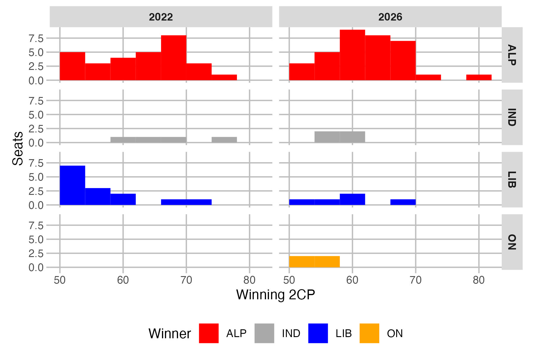 So this chart is similar to the first primary vote chart, but it shows the two-candidate-preferred vote in every seat for each party that made that count (so each seat is shown twice). It is easy to identify whether that party won the seat (is their 2CP over 50%?) so instead I have colour-coded based on who the opposing party is.